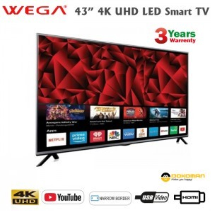 Wega 43" X10 4K UHD LED Smart Android TV, 1GB Ram 8GB Rom, Double Glass Protection